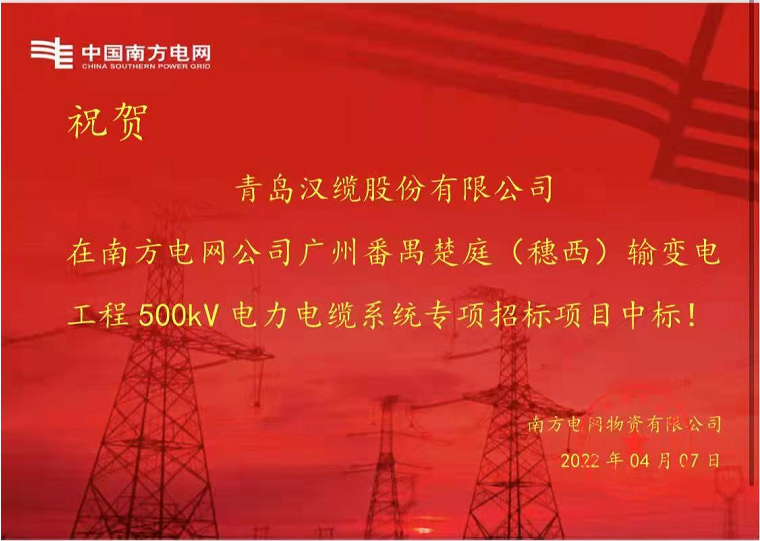 4月7日,青岛汉缆股份有限公司接到南方电网物资有限公司的中标通知,公司赢得中国南方电网公司首个500kV电缆系统重大合同:广州楚庭(穗西)输变电工程提供500kV超高压交流电力电缆及附件。该合同进一步深化了南方电网与汉缆股份的合作,为南方电网公司提供世界一流的电力保障,助力粤港澳大湾区的社会经济发展。项目将全线在电力电缆隧道中安装总长约67km的青岛汉缆供货的500kV,2500mm2超高压交流电力电缆和电缆附件,中标金额约2.6亿元。